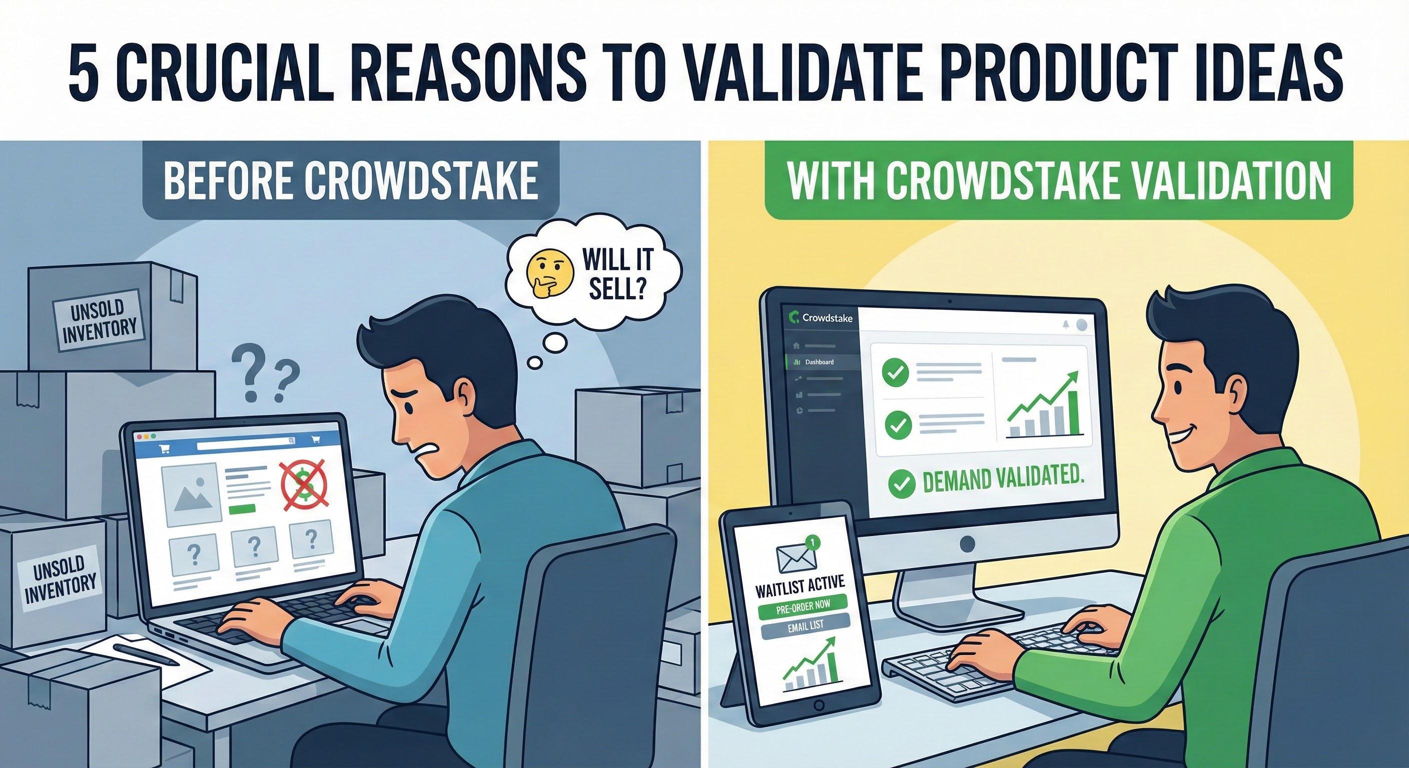 Modern founders have more access to top validation tools that are fast, beginner-friendly, and accurate. With Crowdstake, you don’t have to guess if a pet accessory or kitchen tool will sell. The platform helps you test product demand, gather real customer insight, and fine-tune your products. Instead of guesswork, you avoid a costly mistake, ensuring you’re in that top 5% to 10% of owners who succeed.